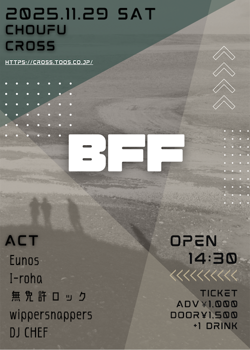 BFF イベント詳細 日付: 2025年11月29日 14:30 – 23:00 カテゴリ: 土曜 2025年11月29日(土) BFF OPEN 14:30 ADV ¥1,000-/DOOR ¥1,500-(+1Drink ¥600-) ACT Eunos I-roha 無免許ロック Wippersnappers DJ CHEF メールでのチケット予約はこちらからMAIL LINE!